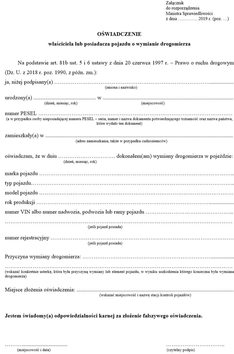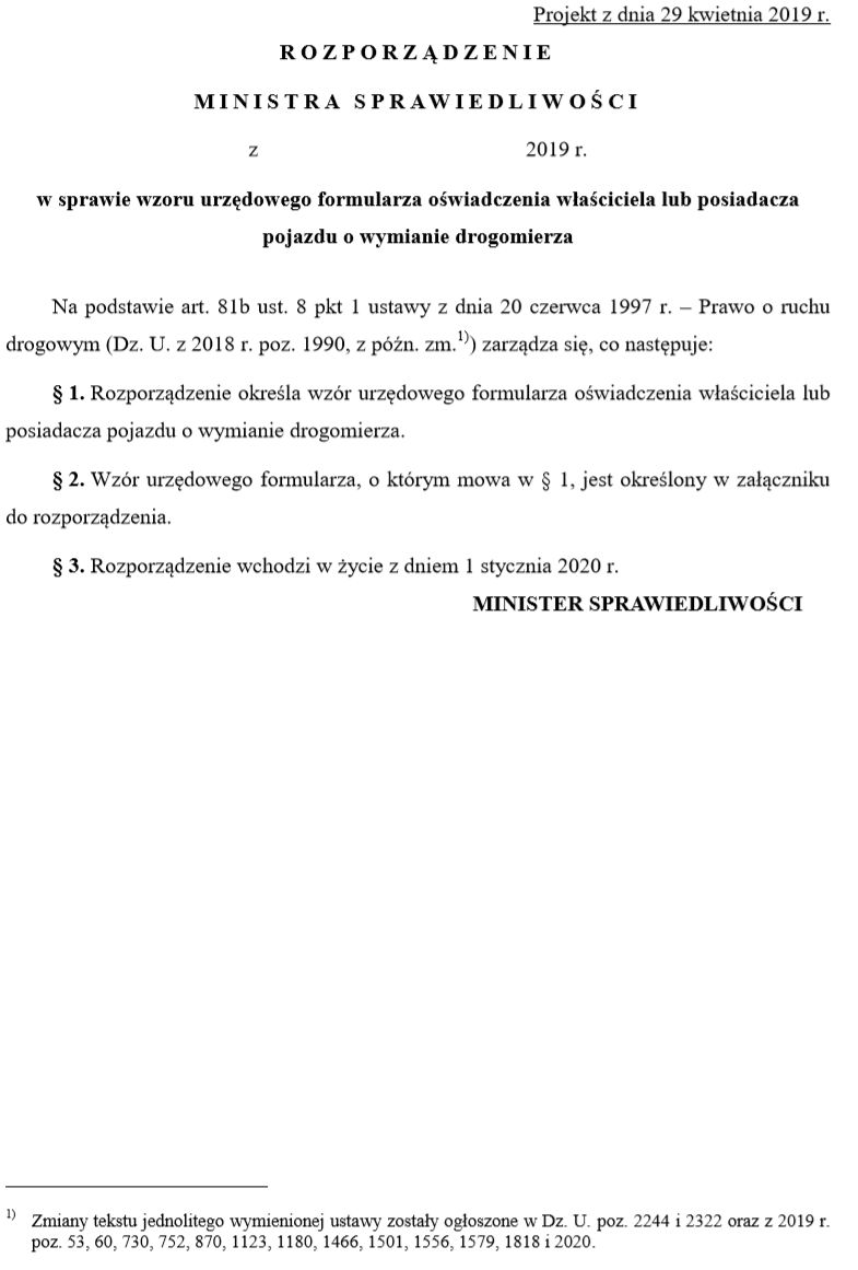 Projekt rozporządzenia Ministra Sprawiedliwości w sprawie wzoru urzędowego formularza oświadczenia dotyczącego wymiany drogomierza